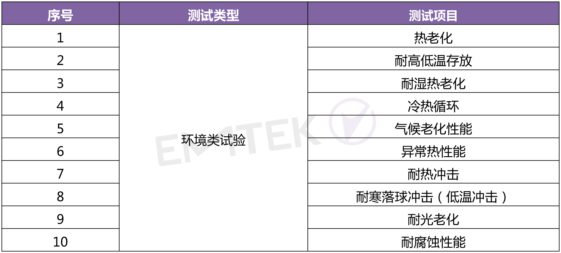 是將產(chǎn)品暴露在自然的或人工的環(huán)境條件下經(jīng)受其作用,以評(píng)價(jià)產(chǎn)品在實(shí)際使用、運(yùn)輸和貯存的環(huán)境條件下的性能,并分析研究環(huán)境因素的影響程度,包含的環(huán)境試驗(yàn)如熱老化、低溫存放、冷熱循環(huán)、耐寒落球沖擊、耐光老化等;