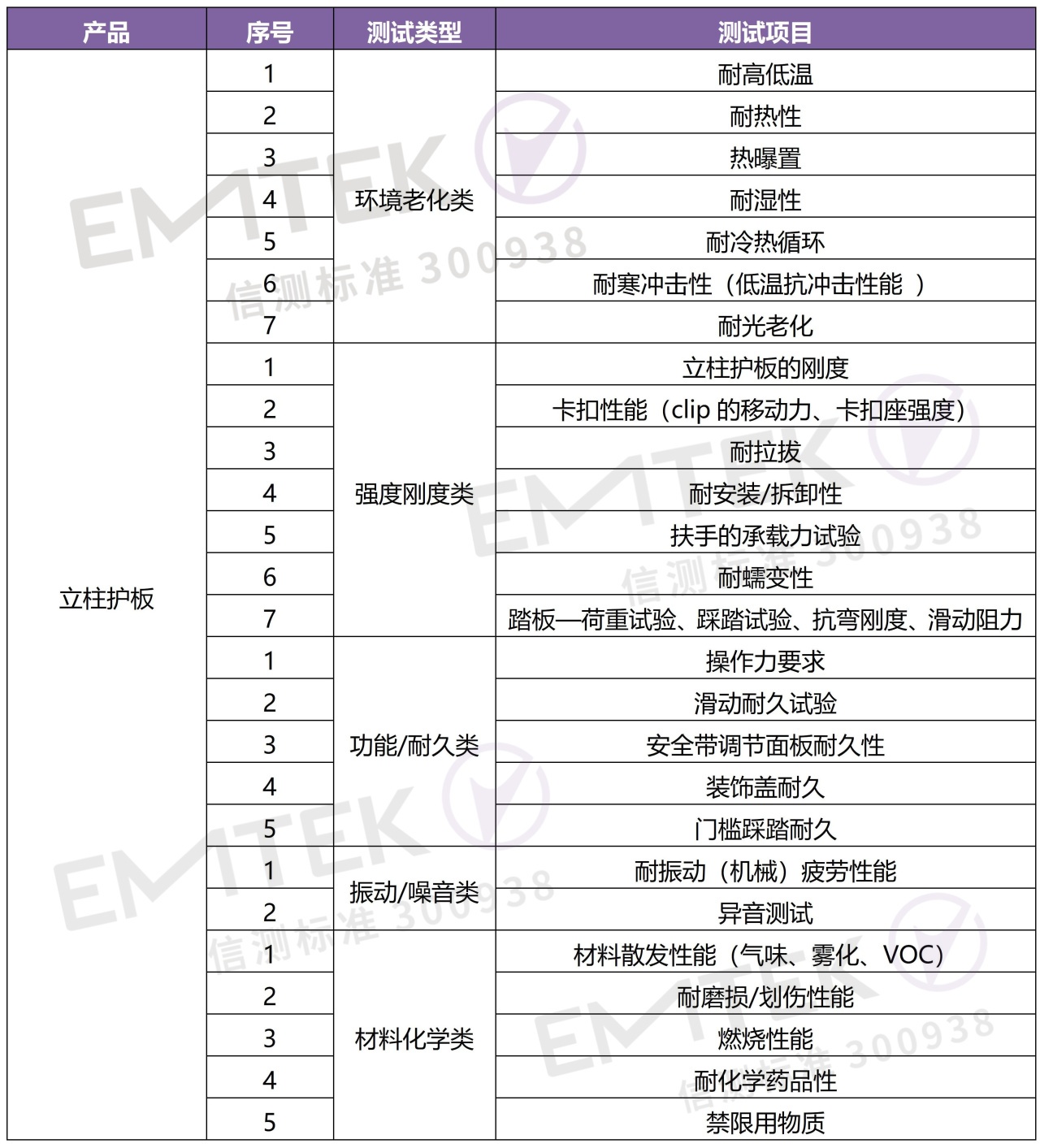 考核產(chǎn)品材料化學性能,比如材料散發(fā)性能、耐磨損/劃傷性能、燃燒性能、耐化學藥品性、禁限用物質(zhì)等。