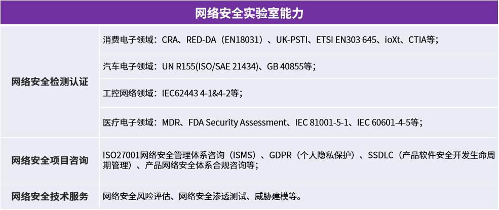 信測標(biāo)準(zhǔn)網(wǎng)絡(luò)安全實(shí)驗(yàn)室位于深圳市南山區(qū)信測標(biāo)準(zhǔn)南山檢測基地,屬于信測標(biāo)準(zhǔn)網(wǎng)絡(luò)安全產(chǎn)線下屬單位,實(shí)驗(yàn)室由擁有多年網(wǎng)絡(luò)安全經(jīng)驗(yàn)的網(wǎng)絡(luò)安全專家及項(xiàng)目經(jīng)驗(yàn)豐富的測試工程師組成,依據(jù)ISO 17025標(biāo)準(zhǔn)建設(shè),具備符合資質(zhì)要求的標(biāo)準(zhǔn)化環(huán)境、設(shè)備、人員及流程。目前已具備智能消費(fèi)電子(含無線電設(shè)備)、汽車及汽車電子、醫(yī)療電子、工業(yè)控制網(wǎng)絡(luò)等四大垂直領(lǐng)域的產(chǎn)品網(wǎng)絡(luò)安全檢測與認(rèn)證能力,同時(shí)還具備半導(dǎo)體、物聯(lián)網(wǎng)設(shè)備制造企業(yè)的OT端網(wǎng)絡(luò)安全體系項(xiàng)目咨詢、安全技術(shù)服務(wù)等相關(guān)業(yè)務(wù)的能力。