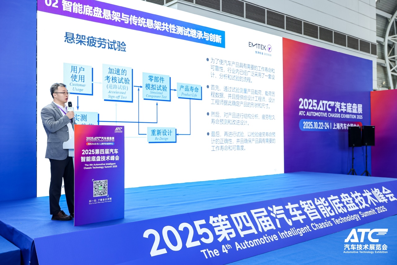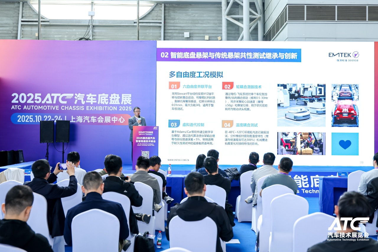 10月22日-24日,2025上海汽車(chē)底盤(pán)系統(tǒng)技術(shù)展覽會(huì)(ATC汽車(chē)底盤(pán)展)在上海汽車(chē)會(huì)展中心(嘉定)盛大開(kāi)幕。本屆展會(huì)規(guī)模達(dá)28,000平方米,吸引了全產(chǎn)業(yè)鏈400余家展商及品牌參展,并同期舉辦10+場(chǎng)技術(shù)峰會(huì)與采購(gòu)配對(duì)會(huì)等活動(dòng)。EMTEK信測(cè)標(biāo)準(zhǔn)精彩亮相展會(huì),圍繞汽車(chē)智能底盤(pán)檢測(cè)技術(shù)方案,鏈接產(chǎn)業(yè)資源,助力行業(yè)安全合規(guī)與技術(shù)創(chuàng)新,并以《汽車(chē)智能底盤(pán)懸架測(cè)試研究》為主題參與2025第四屆汽車(chē)智能底盤(pán)技術(shù)峰會(huì)熱點(diǎn)演講,與海內(nèi)外行業(yè)專(zhuān)家和現(xiàn)場(chǎng)觀眾進(jìn)行了深度分享交流。