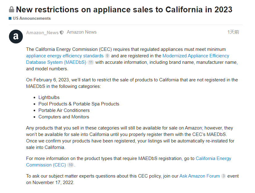 平臺(tái)商家在銷(xiāo)售上述商品時(shí),若未在CEC的MAEDbS正確注冊(cè),商品將無(wú)法通過(guò)亞馬遜在加利福尼亞州銷(xiāo)售。只有亞馬遜確認(rèn)商品已完成注冊(cè)后,商品才會(huì)自動(dòng)恢復(fù),允許在加利福尼亞州銷(xiāo)售。