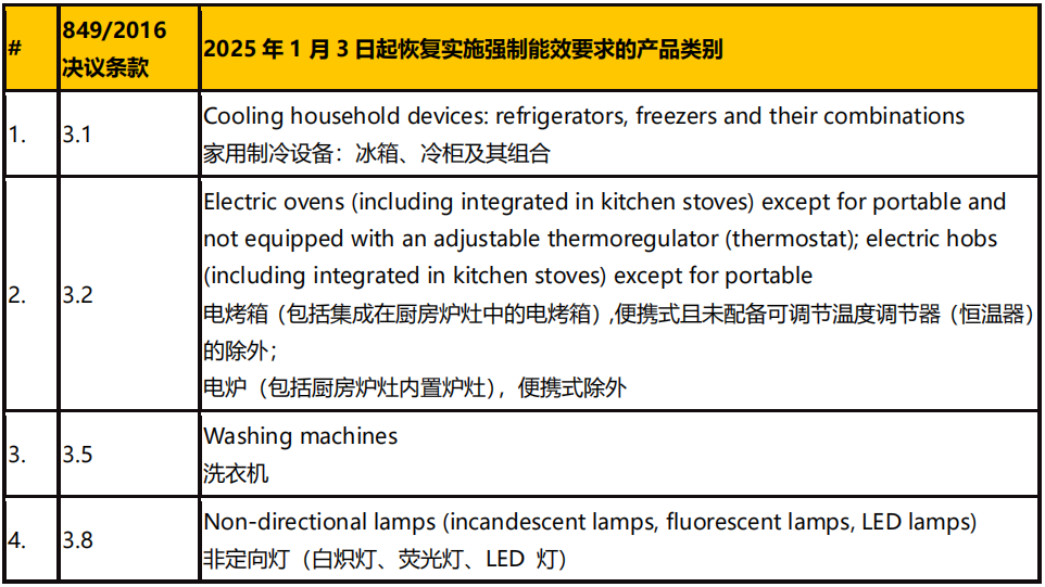 根據(jù)白俄羅斯部長理事會 2024 年 9 月 26 日第 708 號決議,白俄羅斯針對 2016 年 10 月 21 日發(fā)布的第849 號決議中列出的部分(四類)使用能源的電器產(chǎn)品將恢復(fù)實施強制性能源效率/能效標簽要求,強制實施日期為 2025 年 1 月 3 日。