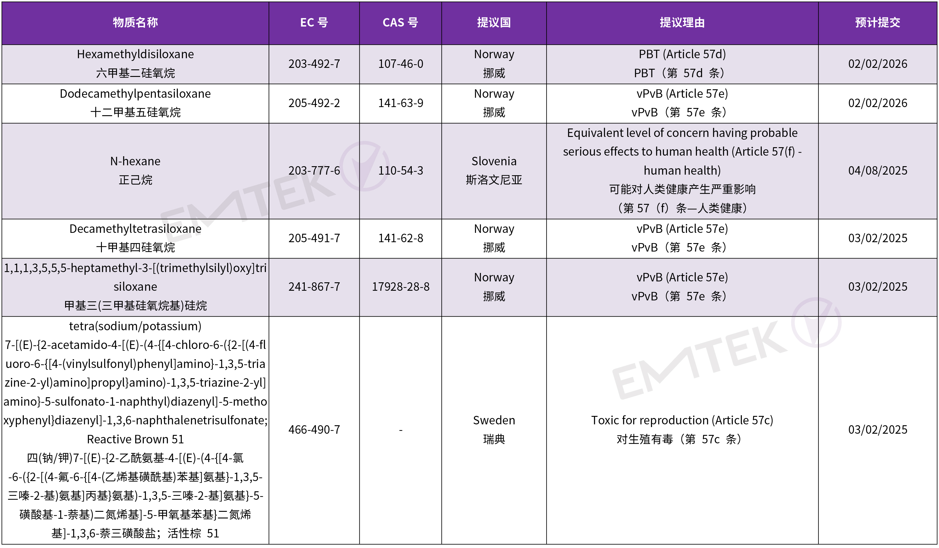 2025年2月18日,歐盟化學(xué)品管理局(ECHA)發(fā)布1項(xiàng)新的SVHC意向物質(zhì)——正己烷。預(yù)計(jì)2025年8月4日前提交相關(guān)反饋意見(jiàn),如反饋意見(jiàn)評(píng)議通過(guò),將被正式加入SVHC候選物質(zhì)清單。截止目前,SVHC 物質(zhì)清單含括: 247項(xiàng)正式物質(zhì),1項(xiàng)(間苯二酚)待決物質(zhì),6項(xiàng)意向物質(zhì)。