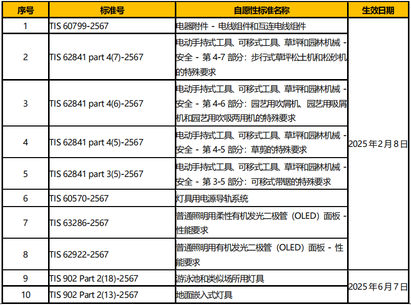 泰國工業(yè)標準協(xié)會(TISI)于 2025 年2 月 7 日更新TIS 標準清單,新增多項自愿性標準,見表 3。