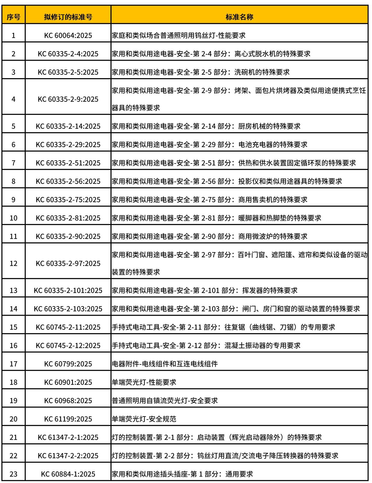 本次修訂范圍廣泛,涵蓋了 KC 系列標準中的 23 個重要類別,見表 1,包括 KC 60332 系列、KC 60745系列等多個關鍵電器安全標準。修訂內容主要集中在三個方面:一是對技術要求進行更新,重點改進產(chǎn)品材料、結構和安全性能指標;二是對測試方法進行優(yōu)化和補充,確保評估更加準確;三是針對特定產(chǎn)品的分類和適用范圍進行調整,使標準更具針對性。