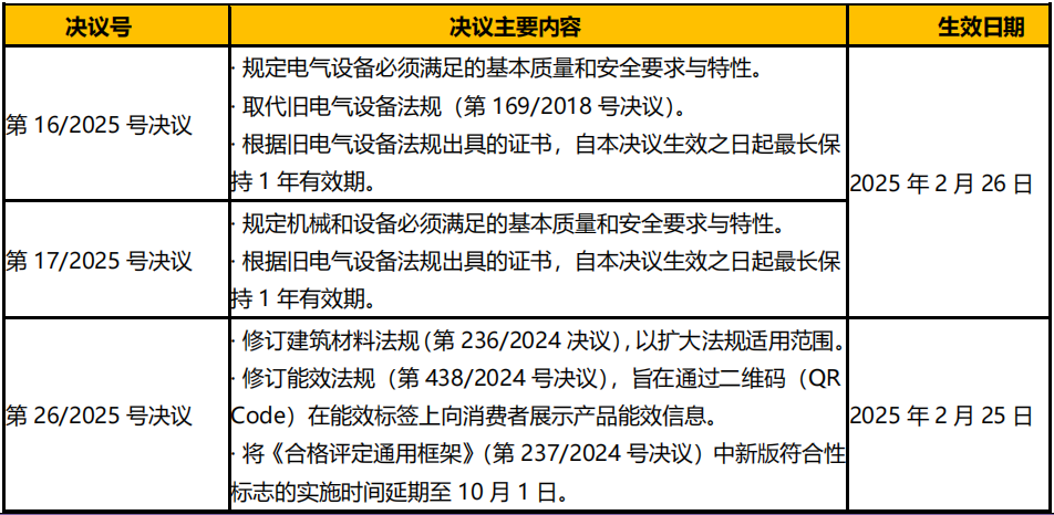 阿根廷工商秘書處于 2025 年 2 月 25 日發(fā)布多項安全和能效相關決議,見表 1: