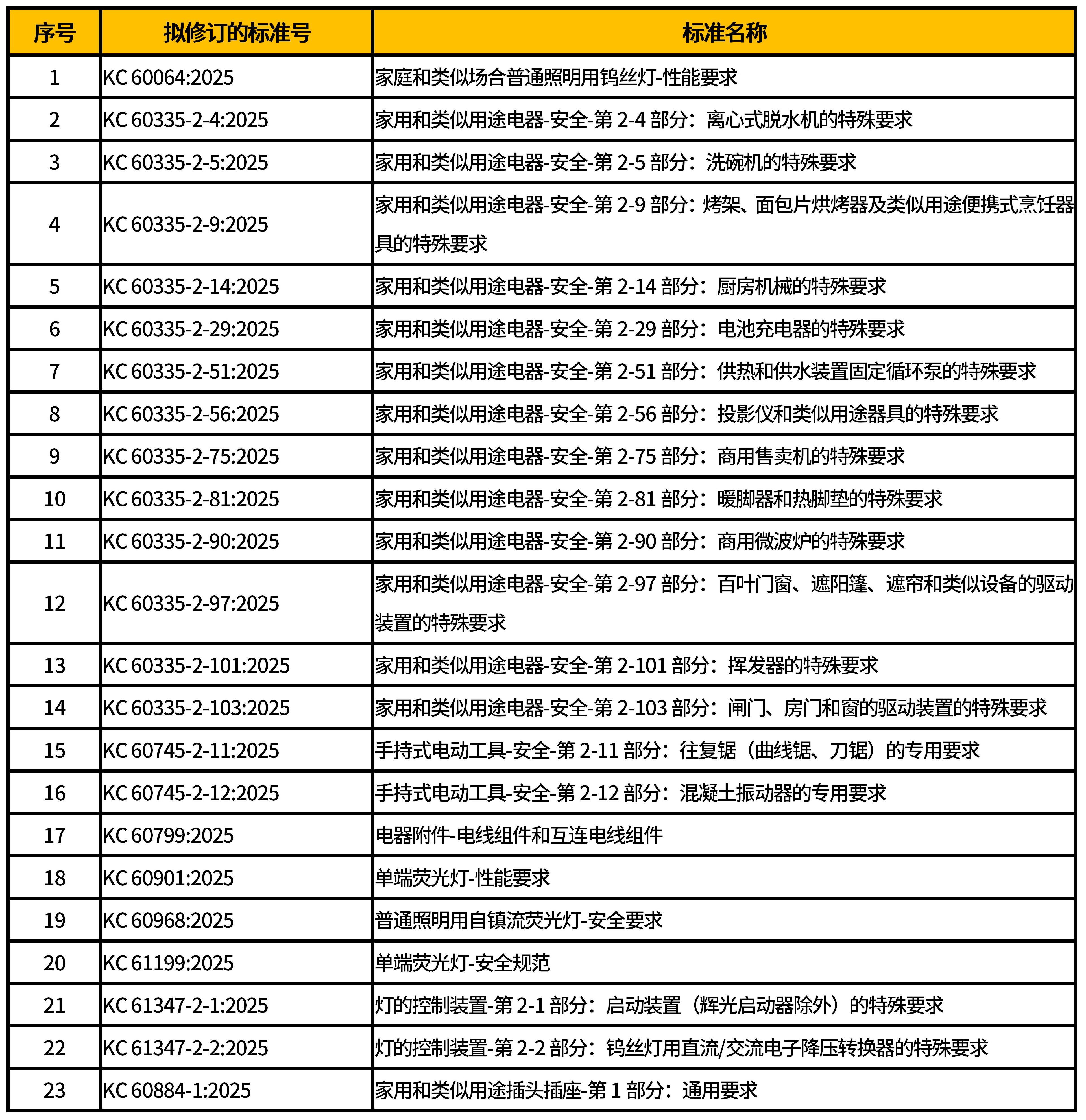 韓國國家標準技術研究院(KATS)于2025年5月22日發(fā)布公告,宣布修訂23項電氣安全標準,見表 1。新版標準自發(fā)布之日起生效,舊版標準仍可適用至2026年5月22日。